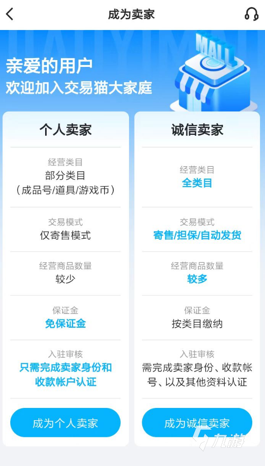 2、接下來,則是關(guān)于商品交易權(quán)限的獲取了。目前平臺(tái)直接為每一個(gè)用戶都開放了賣家身份的申請功能,玩家可以根據(jù)自己的實(shí)際交易情況來選擇不同的身份,每一個(gè)身份都會(huì)讓大家獲得一定的交易權(quán)限,依靠這些權(quán)限玩家們就能夠輕松的將自己的交易內(nèi)容發(fā)布在其他買家能夠看到的頻道內(nèi)。