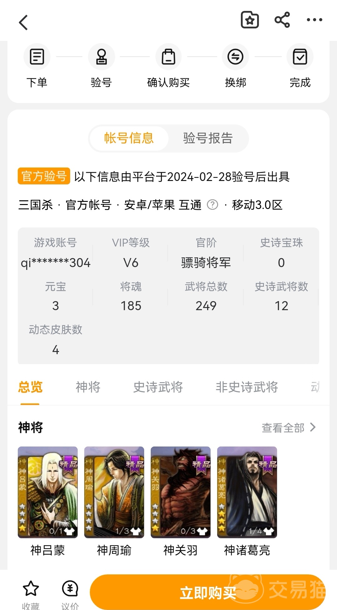 因?yàn)椴簧傩』锇槎紱]有經(jīng)驗(yàn)而且也對(duì)整個(gè)游戲市場(chǎng)行情不太了解,那你就可以先在交易貓當(dāng)中進(jìn)入三國殺游戲?qū)^(qū)之后看看各個(gè)賣家的賬號(hào)詳細(xì)信息和價(jià)格大概是什么內(nèi)容,賣家都會(huì)在詳細(xì)內(nèi)容當(dāng)中神將以及史詩武將等內(nèi)容呈現(xiàn)出來,把有的角色呈現(xiàn)出來再設(shè)置價(jià)格,你就能知道他們之間的關(guān)系大概是什么,這樣你就能更好的知道自己的賬號(hào)能出售什么價(jià)錢了,多對(duì)比幾個(gè)賬號(hào)得到的結(jié)果能更加合理一些,就比如下方圖中的這個(gè)賬號(hào)鏈接當(dāng)中的神將有諸葛亮、關(guān)羽、周瑜、呂蒙等,有其他的史詩武將和人物皮膚等,他的賬號(hào)給出的價(jià)格是320元,所以你可以以他的為基礎(chǔ)來看看自己的賬號(hào)有什么武將。