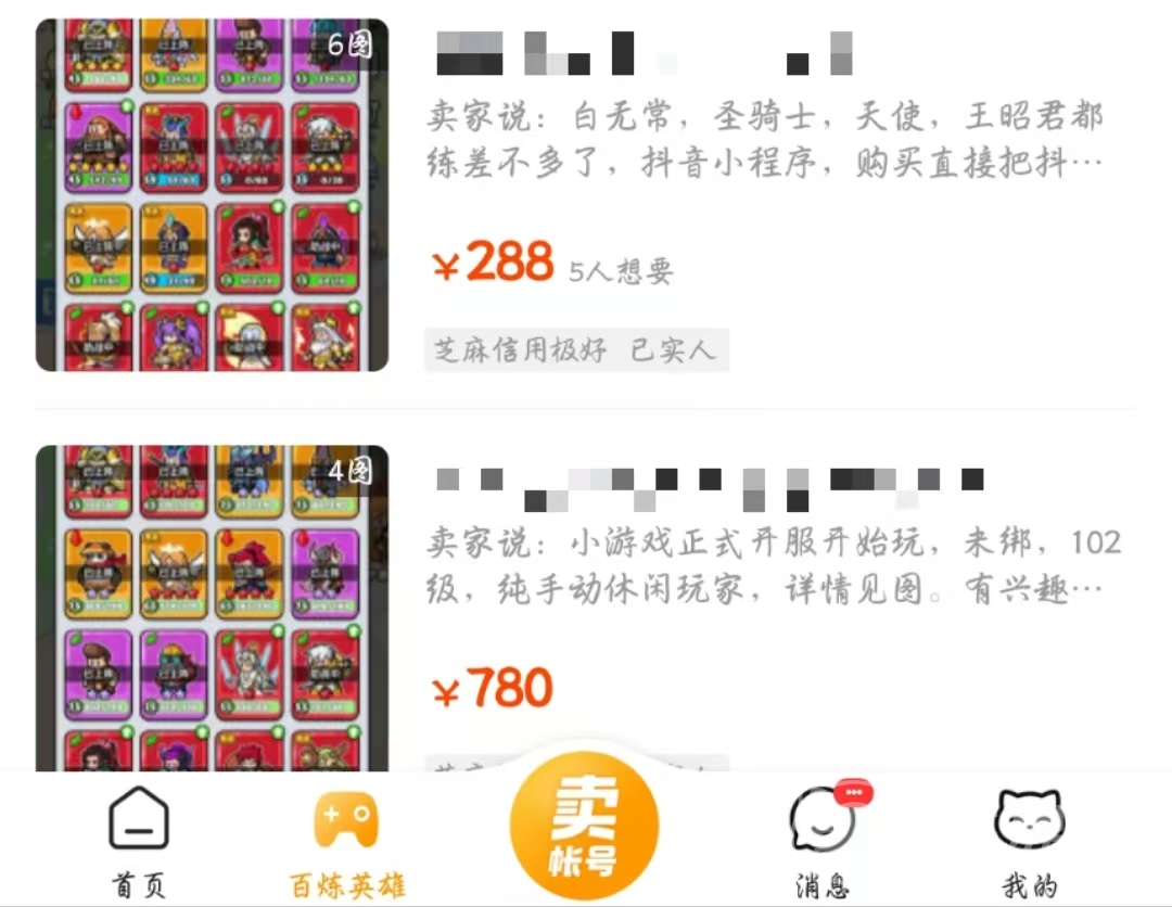 當(dāng)然游戲內(nèi)除了百煉英雄這款游戲還有很多其他游戲的賬號(hào),如果后續(xù)小伙伴們不想玩這款游戲了,也是可以把自己的賬號(hào)放到這上面來賣的,如果玩其他游戲從零開始的話,不妨也考慮在這里找一款適合的賬號(hào)去體驗(yàn),節(jié)省了不少過新手劇情以及收集資源的時(shí)間。