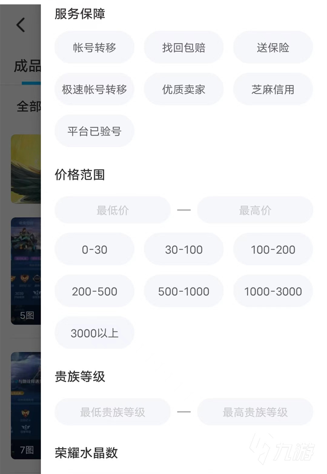 第二點(diǎn)則是安全方面,這里重點(diǎn)集中在安心購和找回包賠服務(wù),因?yàn)榘残馁徍驼一匕r服務(wù)僅針對部分商品,我們可以直接在篩選中選擇帶有相關(guān)服務(wù)的賬號,也可以在挑選賬號后選擇帶有相關(guān)服務(wù)的賬號進(jìn)行購買,以此保障賬號的安全性。