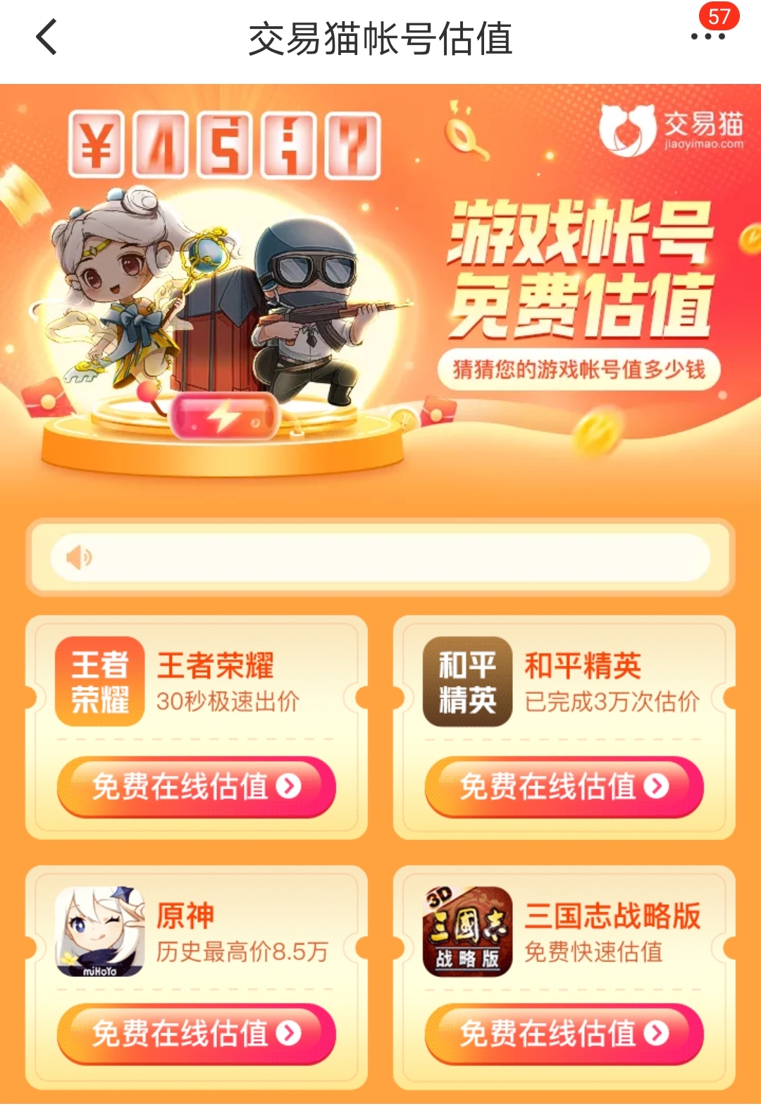 不了解游戲賬號行情的賣家應(yīng)該對估價(jià)這個(gè)事情比較頭疼,而在交易貓APP上,你想要出售原神、王者榮耀、和平精英和三國志戰(zhàn)略版這四款手游,平臺將免費(fèi)提供給大家估號服務(wù)。除這四款以外的游戲,平臺上豐富的在售賬號也能給大家提供售價(jià)參考標(biāo)準(zhǔn),此外,在直播模塊也有主播不定時(shí)開播做估號專場。
