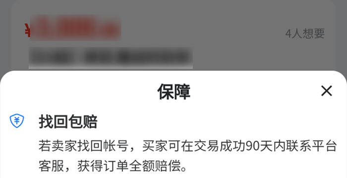 這里我們著重介紹一下找回包賠這個(gè)服務(wù),當(dāng)然是帶有相關(guān)標(biāo)簽的商品才享有的哦。大家都知道游戲賬號(hào)是帶有密保的,就算有了賬號(hào)密碼也只是使用權(quán),是有會(huì)被找回的幾率的。那么在購(gòu)買帶有找回包賠標(biāo)簽的商品之后,如果出現(xiàn)了被找回的情況,大家可以在90天之內(nèi)跟平臺(tái)的客服聯(lián)系,這樣的話是可以獲得全額的賠償?shù)模彩墙o我們的財(cái)產(chǎn)安全上了一把鎖,提供了很大的保障。