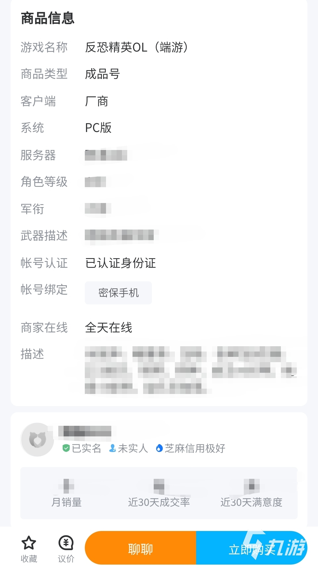 以反恐精英OL為例,點(diǎn)進(jìn)任意一個(gè)在售賬號(hào)的詳情頁,商品類型、客戶端、系統(tǒng)、服務(wù)器、軍銜、武器描述、賬號(hào)認(rèn)證等信息一一羅列,十分直觀、簡潔,比較便于買家查看,也省去了私信賣家咨詢的麻煩。