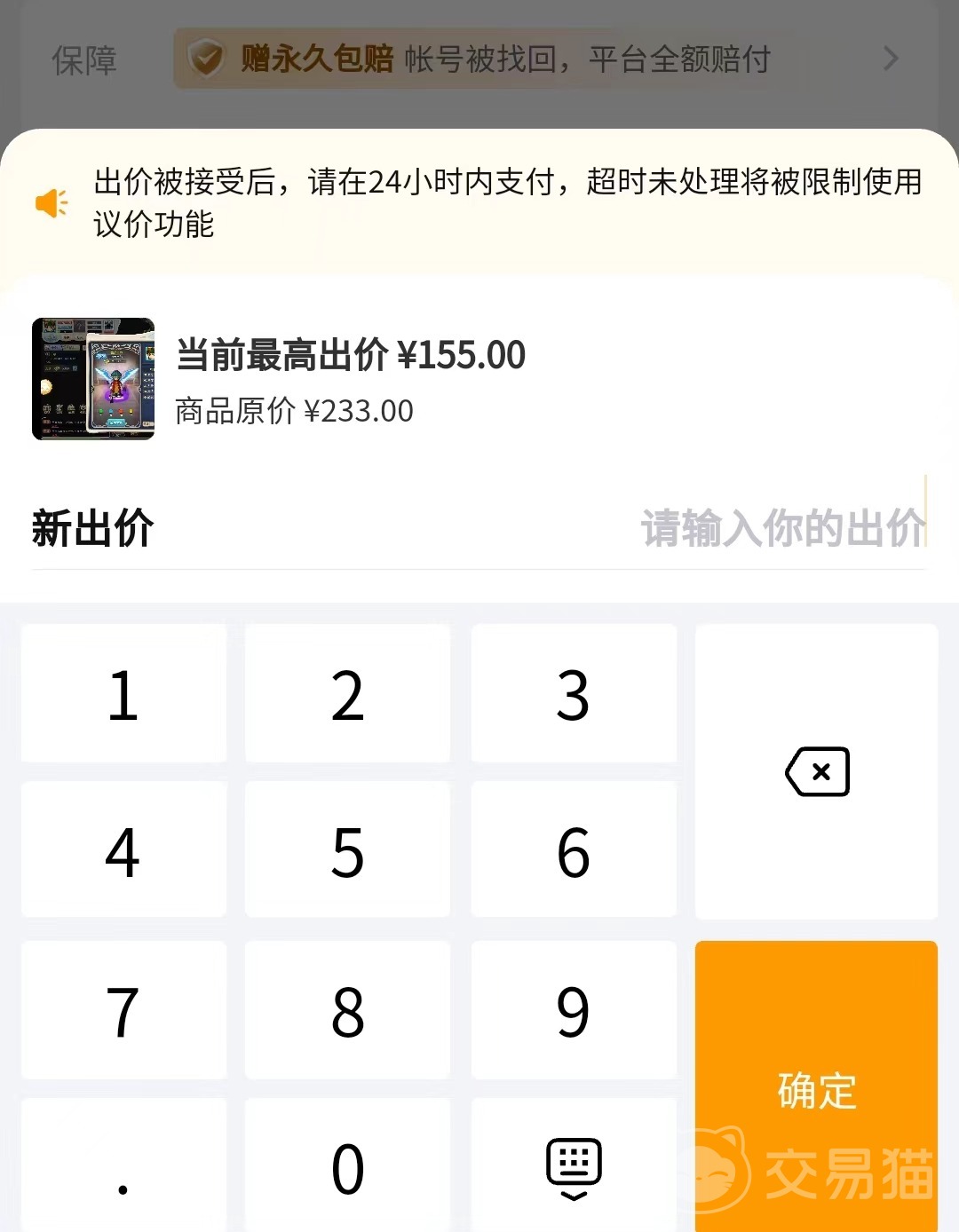 同時在交易貓上進行交易的時候并不是一口價成交,也能和現(xiàn)實交易一樣進行商品價格的協(xié)調(diào)。玩家在交易貓上選擇好了想要交易的賬號之后還能通過商品頁面的【議價】功能來和賣家對賬號的價格進行協(xié)商。在提出了想要的價格之后就等待賣家的確認,如果賣家同意降價的話那么需要玩家在24小時內(nèi)完成本次交易,超過24小時之后議價的價格就算無效。有些賣家也會在游戲賬號商品詳情頁上說明是否接受議價,如果能接受議價的賣家那么協(xié)商降價的成功概率會高很多。