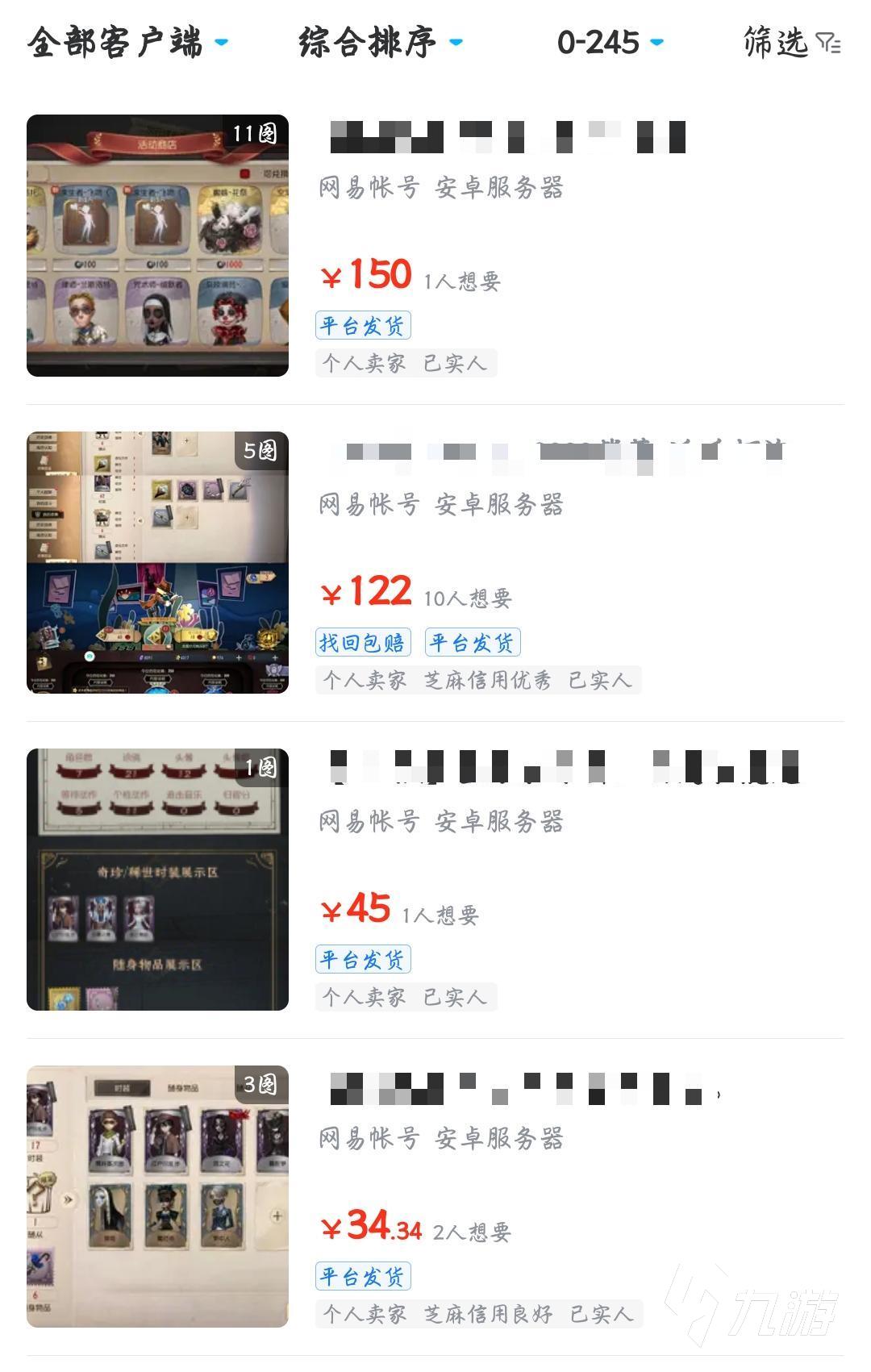 小編在交易貓這個(gè)平臺(tái)大致的搜索了一下部分的第五人格賬號(hào)售賣信息,發(fā)現(xiàn)了100左右可以買到大概10個(gè)紫皮以內(nèi)的第五人格游戲號(hào),運(yùn)氣好的小伙伴們還可以碰到含有一兩個(gè)金皮甚至是限定金皮的號(hào)??偟膩?lái)說(shuō),在交易貓這平臺(tái)小伙伴們100塊還是可以買到很劃算的第五人格游戲號(hào)的。