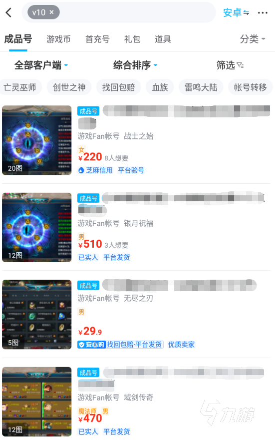如果玩家們是想要以V10賬號開個好頭,就難免會進行比價,價格如上圖所示,綜合排序中的最低顯示為29.9元就可以買到一個不錯的成品號。那么上圖所示的內容,只需要直接搜索“魔域”,找到對應的模塊之后,就在接著搜索“v10”,就可以顯示大量相關的魔域v10賬號內容了。如果搜索還不能令您滿意的話,倒是也可以通過點擊右上方的“篩選”,里頭中可以選擇等級范圍,戰(zhàn)力范圍,職業(yè)和性別等等,能幫助您快速找到想要的商品。