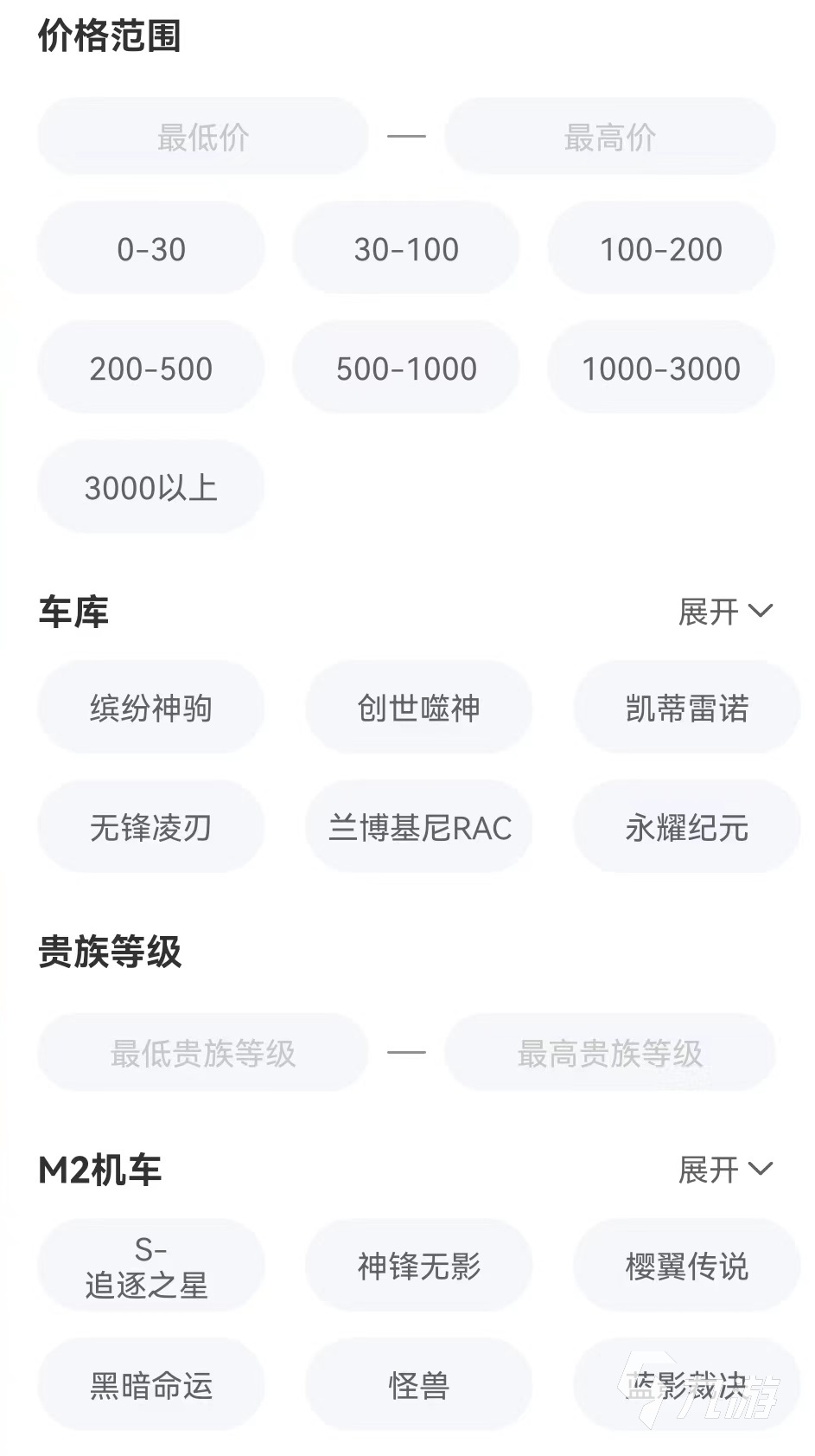 之所以推薦大家選擇交易貓,最重要的就是其中有很詳細(xì)的篩選功能,點(diǎn)擊專區(qū)之后就可以看到,篩選中包括目前所有頂級(jí)車輛,無論有哪些需要直接在這里點(diǎn)擊,就可以將符合要求的內(nèi)容選擇出來。此外還有貴族等級(jí),M2機(jī)車,價(jià)格范圍等一系列選項(xiàng)可以選擇,在大量商品中快速精準(zhǔn)的挑選出來,方便后續(xù)查看。