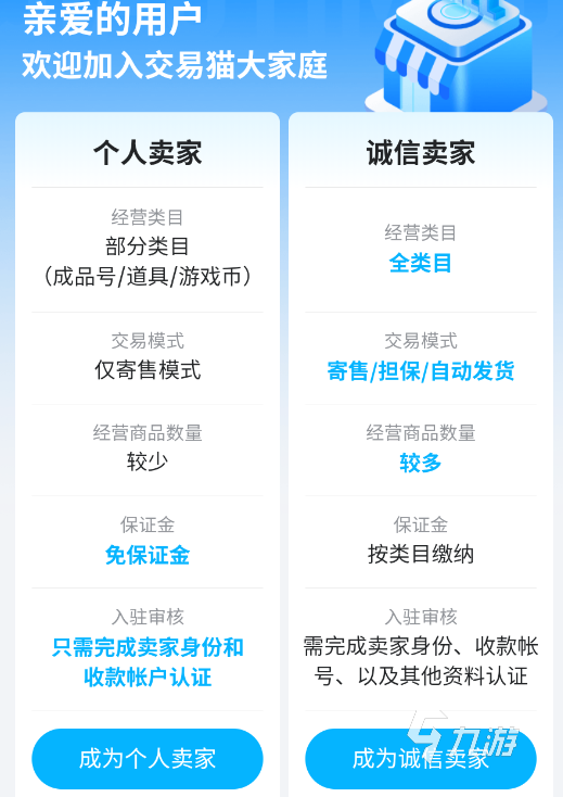 玩家在進入平臺以后,可以點開“我的”,然后這里可以看到可以成為賣家的流程,并且交易貓在賣家上架商品以后,后臺對于買家也是會保持警惕的,如果發(fā)現(xiàn)買家有什么不正當?shù)牟僮?,賣家這邊是很容易是可以發(fā)現(xiàn),并且可以立即投訴后臺,這時候后臺就會在第一時間幫助賣家處理。