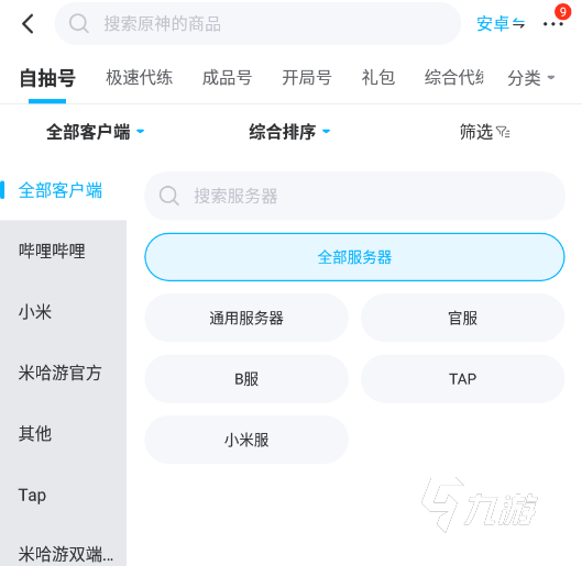 首先我們要進(jìn)入交易貓平臺,然后在搜索界面輸入“原神”并確定,然后在下面找到“全部客戶端”,再往下劃,就可以看到有一個“b服”,然后點擊它就可以選擇所有在售的b服賬號了。