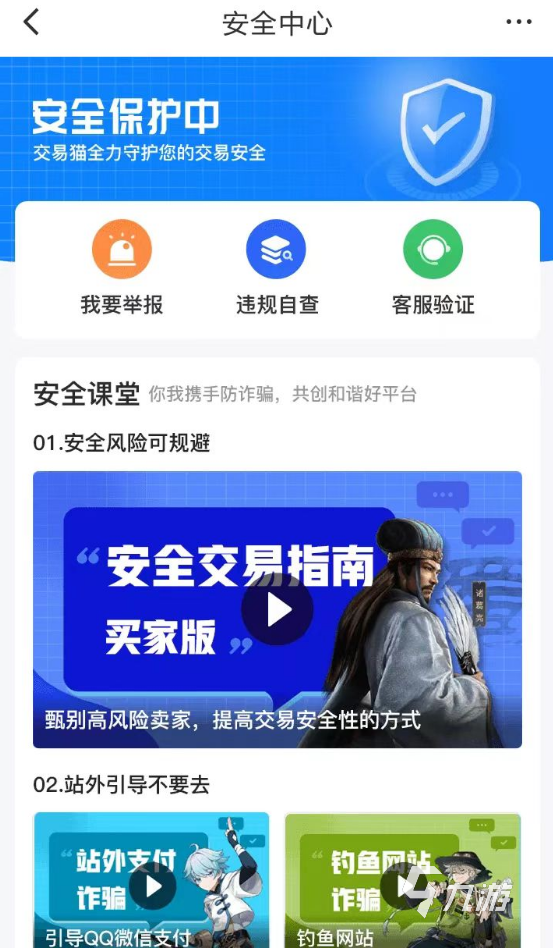 3、為了提高買賣雙方對交易的安心程度,平臺內(nèi)還為大家專門提供了一個安全中心,在這里大家可以瀏覽到相關(guān)的防騙教程,同時也可以舉報各種虛假的商品信息,讓玩家們進行深度的參與,同時會有效提升交易安全性。