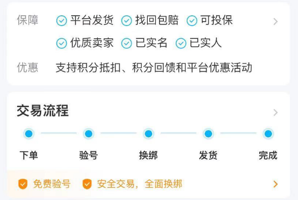 而通過商品的詳情頁,大家也能夠發(fā)現(xiàn),平臺能給予玩家的保障是非常的多,比如找回包賠,它是針對部分商品提供的,尤其是安心購一類的賬號基本都能夠享受該服務,同時還有安全性的投保和優(yōu)質(zhì)賣家的認證,這些都是對買家的保障,也是幫助賣家促進成交的手段之一,同時平臺的交易流程也是清晰可見,其中就包括了在線免費驗號以及平臺換綁等服務,讓交易順利進行。