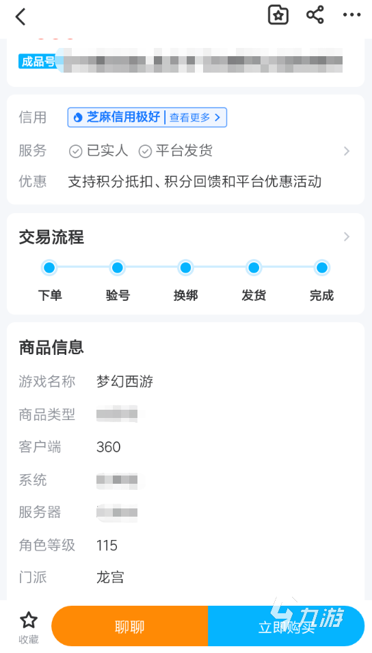 2、接下來是想要通過交易貓來購買一個360賬號的玩家,大家只需要進入一個游戲商品的詳情頁面,在商品信息當中就可以觀察到該賬號是否屬于360類型。如果是的話,那么就表明該商品是符合玩家交易條件的。
