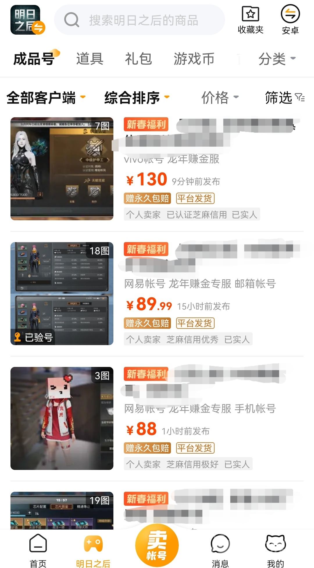 來(lái)源: 極光 作者: 丫丫 2024年02月14日 11:03明日之后這個(gè)游戲當(dāng)中充滿(mǎn)了挑戰(zhàn)與冒險(xiǎn),也是開(kāi)放世界游戲代表之一,很多小伙伴都想體驗(yàn)這個(gè)我滿(mǎn)挑戰(zhàn)的游戲,為了讓大家安全到購(gòu)買(mǎi)到賬號(hào),小編在下面的內(nèi)容當(dāng)中講講購(gòu)買(mǎi)明日之后賬號(hào)的平臺(tái)有哪些,給大家介紹的交易貓?zhí)峁┮恍┵I(mǎi)號(hào)的指引,可以瀏覽到各種各樣類(lèi)型的明日之后游戲賬號(hào),全面的了解賬號(hào)然后下單購(gòu)買(mǎi)。