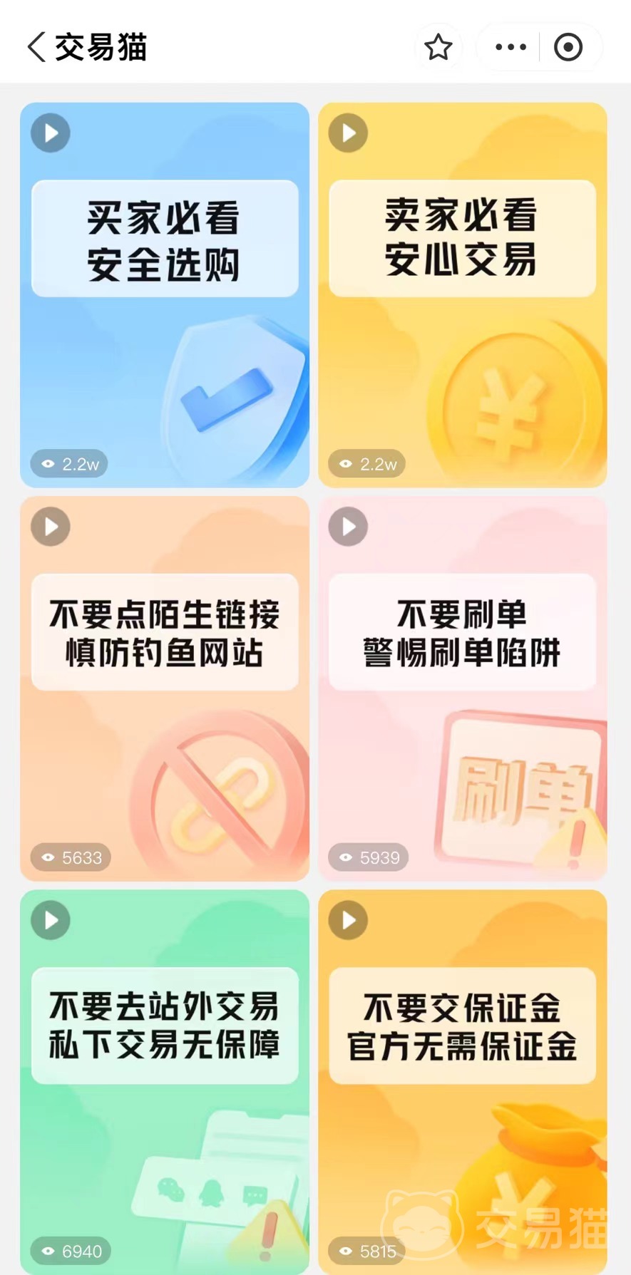 對(duì)于平臺(tái)上架的每一筆訂單,交易貓都執(zhí)行著嚴(yán)格的審核制度,確保交易的合法性與真實(shí)性。它對(duì)玩家的訂單專業(yè)性和安全性超級(jí)重視!平臺(tái)上有個(gè)“安全中心”板塊這一板塊旨在為廣大“涉世未深”的用戶提供防騙知識(shí)的普及,讓他們能夠在網(wǎng)購的道路上更加從容與自信。每一項(xiàng)防騙要點(diǎn),交易貓都精心準(zhǔn)備了相應(yīng)的視頻教程,以直觀生動(dòng)的方式為用戶科普防騙知識(shí),助力他們迅速成長(zhǎng)為防騙小達(dá)人。