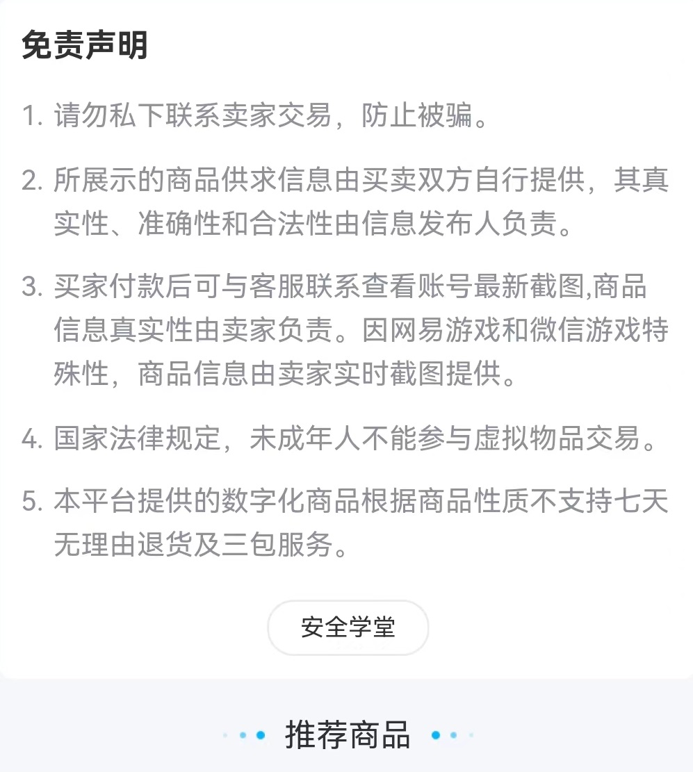 平臺在保證交易安全方面最有力的措施就是設(shè)置了多項規(guī)章制度,并且在整個商品交易環(huán)節(jié)嚴(yán)格遵照規(guī)章。對于出售者來說也提供了很多有利的保障措施,其中最關(guān)鍵的一點就是在出售后不支持無理由退貨,這是基于游戲賬號特殊商品所決定的。這一點平臺在出售的時候已經(jīng)明確告知購買方,同時進行了一系列詳細(xì)的認(rèn)證和確認(rèn),所以不會給出售者帶來后續(xù)任何麻煩。