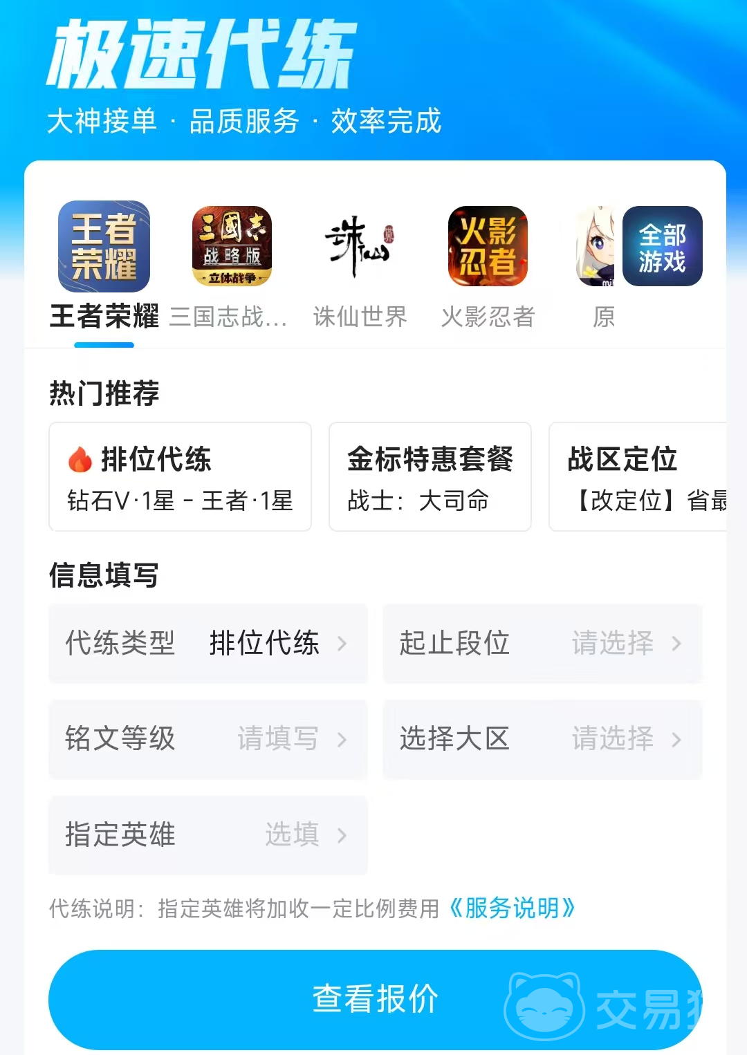 王者榮耀主要還是5v5公平對抗游戲,其皮膚并不能帶來特別多的屬性,需要通過技術(shù)才能打到理想的段位,但是有些玩家實(shí)在是沒有時間,那么就會選擇代練的方式去上到厲害的段位,那么交易貓的極速代練功能就能為玩家找到合適的高手,從而快速上分,信譽(yù)都挺高的。