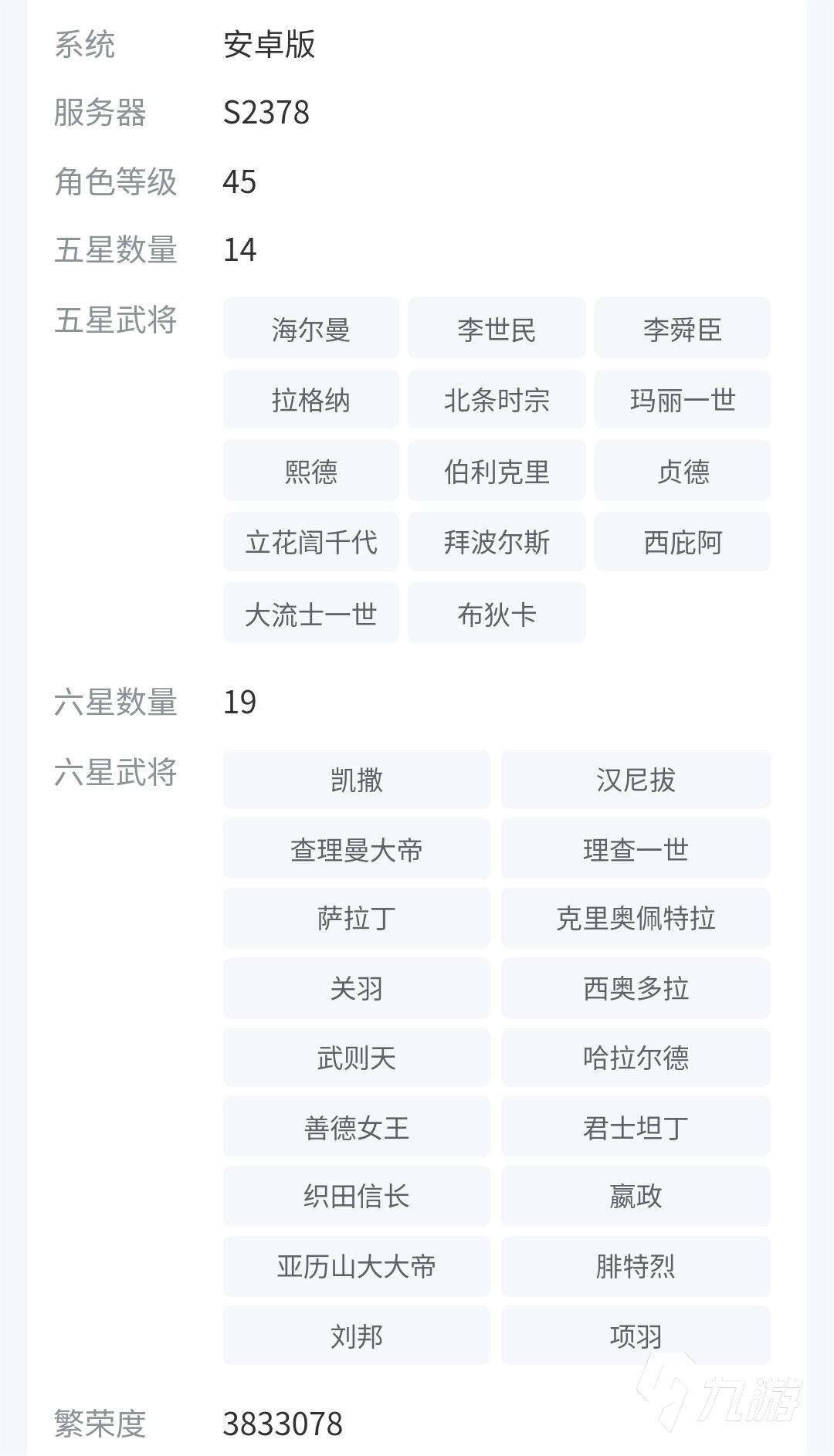 除去文明與征服游戲的自抽號,小編覺得這個游戲的成品號也是很值得推薦的,交易貓平臺內(nèi)有很多文明與征服的成品號游戲賬號,想要購買文明與征服游戲賬號的小伙伴們可以清晰的看到游戲賬號的詳細(xì)情況,賣家都做了非常仔細(xì)的介紹,小伙伴們從下圖可以清晰的看到賬號的內(nèi)容情況,包括角色的星級情況和數(shù)量等。
