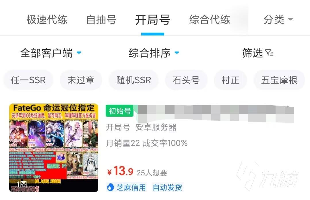 FGO的開(kāi)局號(hào)基本上就是讓大家開(kāi)局就能夠指定進(jìn)入游戲后的角色,也可以是隨機(jī)五星SSR角色,當(dāng)然隨機(jī)是要比自選便宜的,在交易貓的定價(jià)目前就是個(gè)五星角色初始號(hào)價(jià)格大概在40元左右,而且都是純手工代搓的沒(méi)有過(guò)章節(jié)劇情的簽到賬號(hào),前期的新手資源都幫大家領(lǐng)取了,而且都是三無(wú)送活郵箱的,買(mǎi)到手之后就可以自己綁定,出現(xiàn)任何問(wèn)題平臺(tái)會(huì)督促賣家售后。