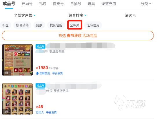 之所以推薦這個平臺主要是因為這個平臺上的游戲賬號比較全,一些小游戲的賬號交易貓都有,鐵桿三國中的新區(qū)號也有,成品號中的各種角色都比較滿,神級關羽很多賬號都已經收集到了,大家想要獲取關羽就可以找這種關鍵詞來篩選。