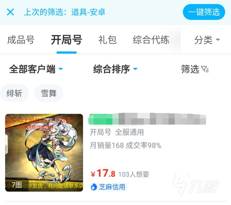 1.賬號(hào)類型齊全,一鍵篩選即可快速瀏覽,這里我們挑選一款需要抽獎(jiǎng)的游戲舉例,就說(shuō)說(shuō)忍者必須死3,這游戲中的武器、忍者角色都需要抽獎(jiǎng)獲取,包括個(gè)別追求極致的玩家,對(duì)于寶物的獲取也很有研究,而在交易貓的忍者必須死3專區(qū)當(dāng)中,大家可以進(jìn)入篩選功能,將初始號(hào)——開局號(hào)給勾選上,接下來(lái)就會(huì)為大家推薦這類賬號(hào),可以看到多個(gè)類型都有涵蓋,想要什么武器、角色的話,在這里就可以輕松挑選到。