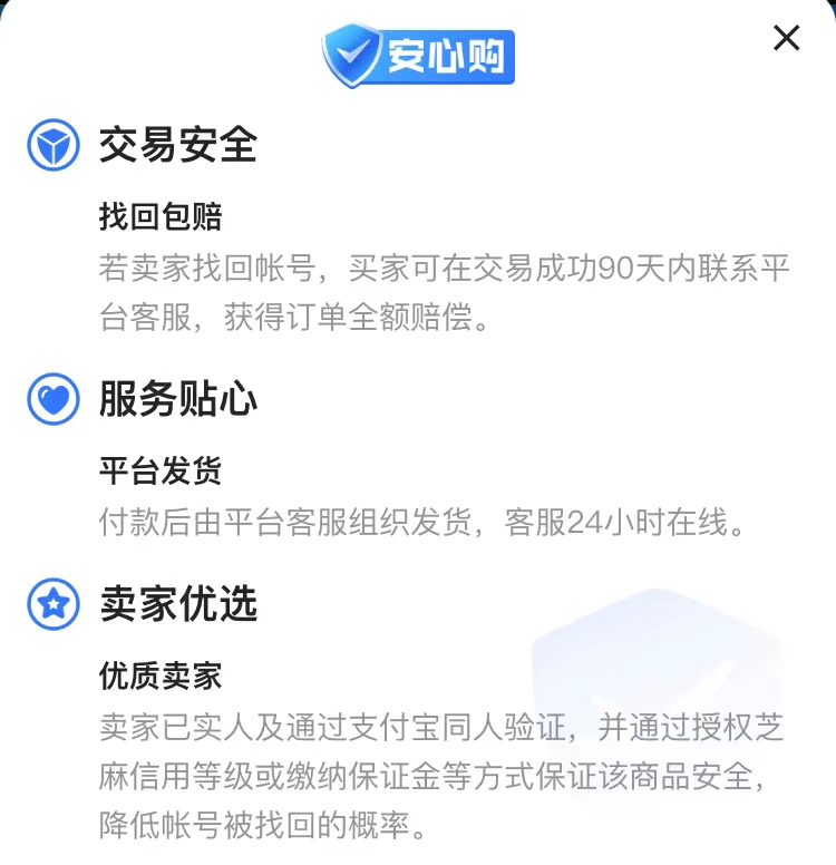 其實(shí)交易貓遠(yuǎn)比大家想象的要安全的多,多種服務(wù)的安心購(gòu)保障安全。只要大家選擇購(gòu)號(hào)的話,記得選擇安心購(gòu)服務(wù)的商品優(yōu)先,這個(gè)服務(wù)的話針對(duì)商品的售后去做的,能夠保證大家在買回去賬號(hào)后,賣家如果對(duì)于賬號(hào)進(jìn)行找回或是其他影響賬號(hào)使用的情況下,那么買家是可以直接向平臺(tái)要求賠償?shù)?。所以多一份服?wù)就是多一份保障,相信大家都能夠更加重視起來(lái)。