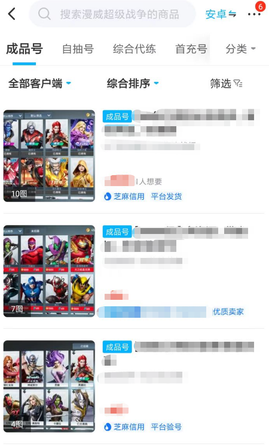 3、當(dāng)然,如果你還是喜歡傳統(tǒng)的商品瀏覽方式,那么搜索進(jìn)入到漫威超級(jí)戰(zhàn)爭(zhēng)的專(zhuān)區(qū)當(dāng)中,各種精準(zhǔn)的賬號(hào)交易內(nèi)容將呈現(xiàn)在玩家眼前,大家可以在這里找到符合自己要求的商品,更關(guān)鍵的是玩家們不會(huì)拿出太多的預(yù)算即可得到滿足。