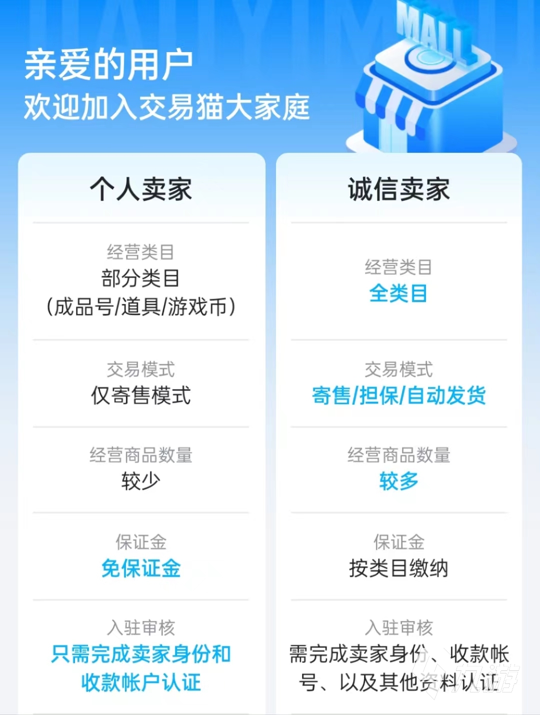 在交易貓中出售咱們的穿越火線賬號時非常簡單的,即便是第一次接觸的小伙伴也可以輕松上手。咱們下載好交易貓后,首先咱們需要進行商家入駐,交易貓中共有兩種類型的商家,分別是個人賣家和誠信賣家,前者入駐簡單只需要實名和綁定支付寶即可,后者需要有更多的信息證明,不過會有更多的服務(wù),小伙伴們可以根據(jù)自己的需求去選擇。