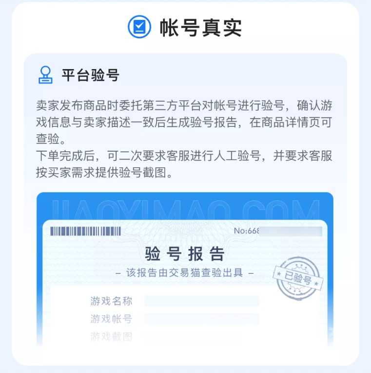 對于想要買號的伙伴來說,安全這個選項肯定是首位,然后就是所購買的商品是否跟介紹的有任何出入,在者售后的問題。交易貓自帶的驗號操作可以通過客服的協(xié)助幫你檢測商品的真實性,帶有獨立編碼的截圖確認之后才會正常發(fā)貨的,如果出現(xiàn)任何的問題及時聯(lián)系客服都可以進行退換的。封號和找回的情況,都是可以按照相應(yīng)條件進行合理賠付的。