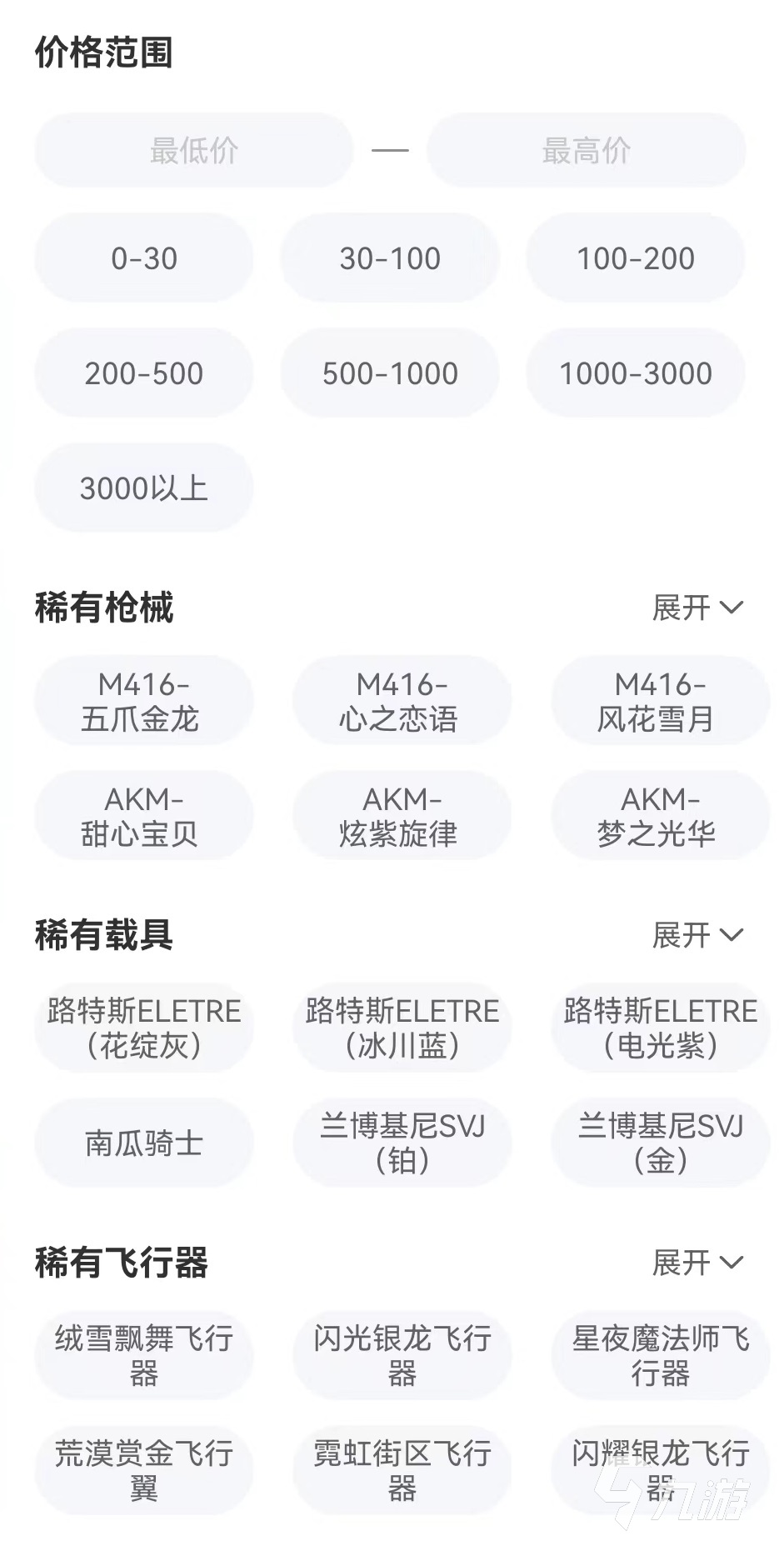 在每一款上架賬號詳情中都有非常清楚介紹,里面不僅標(biāo)出了此賬號所在區(qū)服和系統(tǒng),以及擁有哪些稀有槍械和稀有載具、時(shí)裝等。并且將具體名字也通過列表的方式羅列出來,在篩選中也同樣加入了這些內(nèi)容,能夠輕松通過點(diǎn)擊方式就將自己所需要商品選擇好,這樣極大方便了挑選。例如想要選擇帶有蘭博基尼跑車賬號,直接選擇蘭博基尼所屬各種顏色,就能選擇出。