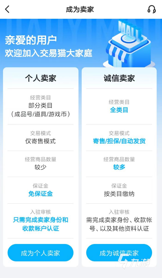 2、不過,畢竟每一個(gè)玩家所需的游戲交易想法有著很大的區(qū)別,當(dāng)有人開始買號的同時(shí),自然也會有部分老玩家準(zhǔn)備脫坑。此時(shí),各位也可以在交易貓當(dāng)中去開通一個(gè)賣家身份,自然就可以得到在平臺內(nèi)發(fā)布交易商品的權(quán)限,而整個(gè)申請的流程步驟,基本上不會浪費(fèi)大家太多的時(shí)間即可。