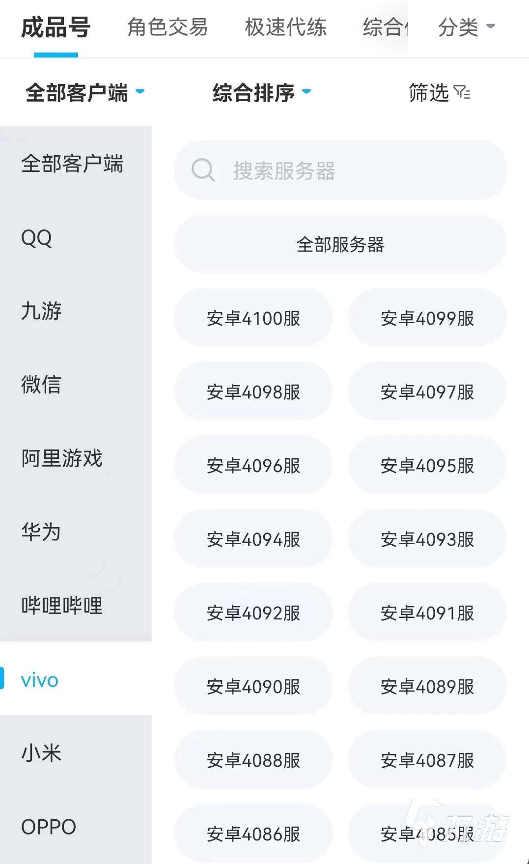 在這里要想購(gòu)買vivo游戲賬號(hào)非常方便,只要確定想要購(gòu)買的游戲支持該客戶端,就可以開始查找。因?yàn)橛螒蛸~號(hào)在上架的時(shí)候就已經(jīng)提前注明了所屬客戶端,所以這里有直接選擇功能。在對(duì)應(yīng)專區(qū)中可以看到有全部客戶端選項(xiàng),在其中找到vivo,就能看到有所有該客戶端下的服務(wù)器??梢赃x擇指定一個(gè)服,也能夠直接全部選擇,這樣所找出來的就都是符合要求的內(nèi)容。選中之后購(gòu)買的流程和方式與其他客戶端完全相同沒有任何區(qū)別。
