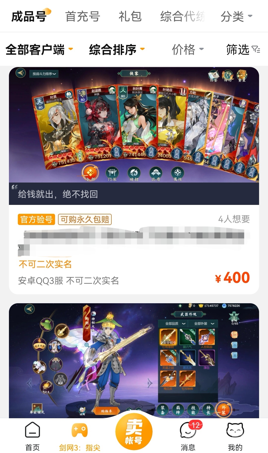 購買游戲賬號(hào)可以說是省時(shí)省力了,也就意味著將會(huì)加入一個(gè)有組織的團(tuán)隊(duì),增加與其他玩家的交流機(jī)會(huì),某些賬號(hào)還擁有非常多的裝備和角色,讓玩家享受到更好的游戲體驗(yàn),購買高級(jí)的賬號(hào)擁有更多稀有裝備,還能展示出自己的實(shí)力和成就而獲得更多人的關(guān)注與認(rèn)可,所以平臺(tái)當(dāng)中的許多用戶都想購買到這種比較活躍的賬號(hào)來體驗(yàn),特別是像劍網(wǎng)三這種比較熱門火爆的游戲更是擁有非常多的賬號(hào)資源了。想要購買游戲賬號(hào)的首先應(yīng)該下載安裝交易貓,不論什么身份都必須要經(jīng)過平臺(tái)的認(rèn)證審核,這樣你才能去找專區(qū)選賬號(hào),賬號(hào)類型更是數(shù)不勝數(shù),成品號(hào)、首充號(hào)、初始號(hào)和,貴族賬號(hào)都應(yīng)有盡有,因?yàn)橘Y源豐富也吸引了非常多的小伙伴。