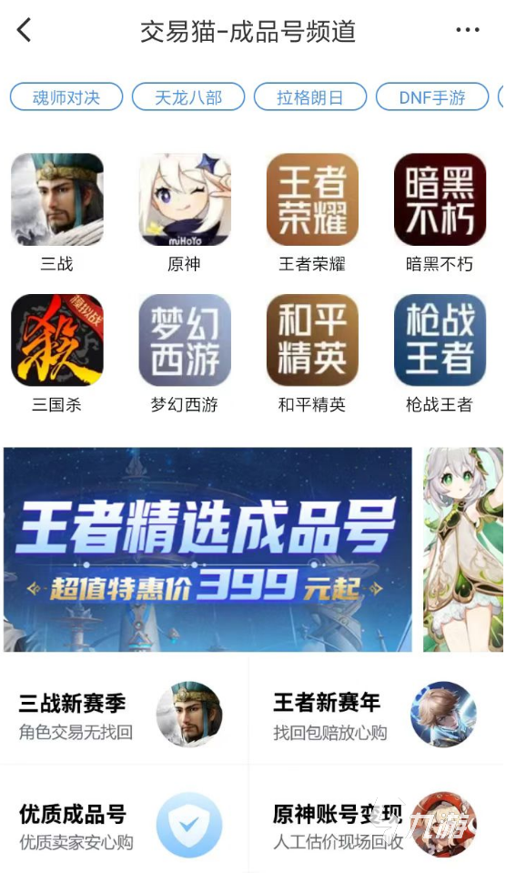 3、當(dāng)然了,并不是所有玩家都會(huì)一直去玩一款游戲,隨著越來越多精品游戲的出現(xiàn),玩家們的選擇也會(huì)更多,同時(shí)交易需求也會(huì)更廣泛。平臺(tái)也會(huì)為此提供一個(gè)包含了大量熱門游戲的成品號(hào)專區(qū),在這里玩家將輕松購買各種類型的高級(jí)游戲賬號(hào)。