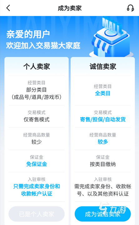 當(dāng)然了,大部分想要知道價(jià)值的小伙伴都考慮過將賬號出售,其實(shí)交易貓這款軟件就帶有強(qiáng)大的賣號功能。在這里能夠非常方便地獲取到賣家資質(zhì)并且將自己的賬號上架掉,而且還可以利用到交易安全險(xiǎn)、找回包賠、平臺驗(yàn)號等服務(wù)來加大曝光度,從而促進(jìn)成交。