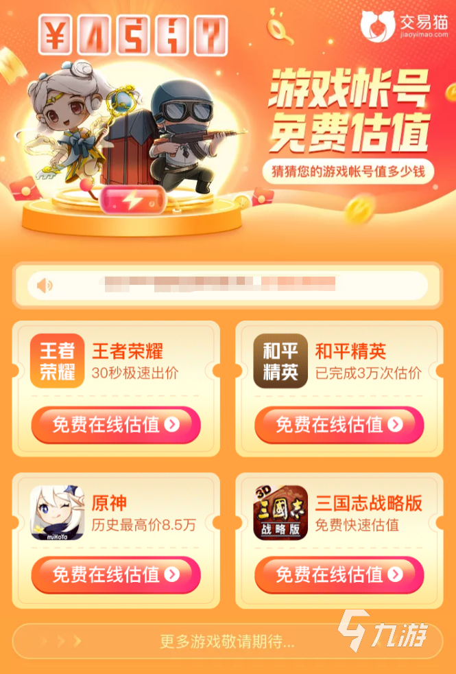1、針對(duì)不太了解交易行情的玩家,交易貓直接開(kāi)放了游戲號(hào)估價(jià)功能,對(duì)于第一次進(jìn)行賬號(hào)出售的玩家來(lái)說(shuō),可以利用此功能來(lái)快速了解到值得參考的交易價(jià)格區(qū)間,避免各位胡亂的出價(jià)導(dǎo)致游戲號(hào)無(wú)法進(jìn)行出售。