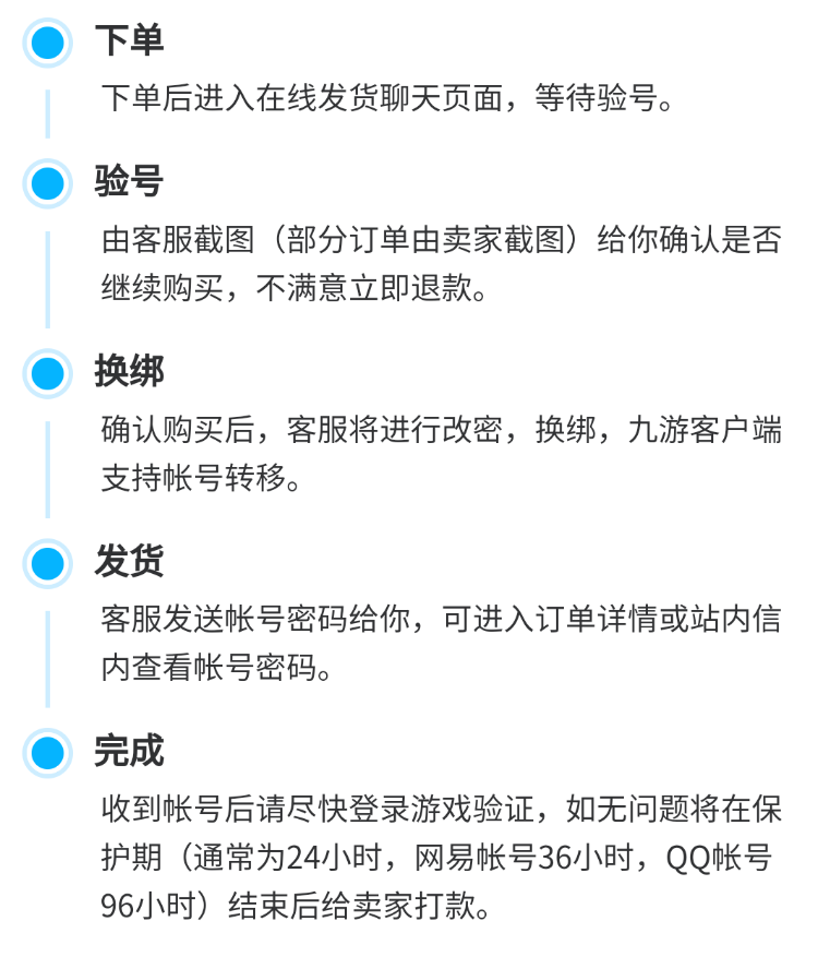 1.交易流程中規(guī)中矩,整體可分為五個步驟,如下圖所示,沒有任何花花腸子,大家只需要按照圖示步驟一步一步操作,最終都可以安全買到賬號。并且整個過程操作簡單,哪怕是從未用過交易軟件的小白,也可以很快理解并上手操作,作為新人想來買賣個游戲賬號,輕輕松松。