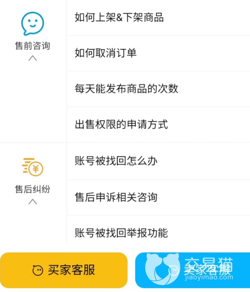除了平臺(tái)靠譜以外,交易貓還非常適合之前沒(méi)有進(jìn)行過(guò)賬號(hào)交易行為的新人玩家,在平臺(tái)里無(wú)論是新人賣(mài)家還是買(mǎi)家,平臺(tái)都會(huì)提供相關(guān)的交易流程分享,若是看了還不明白的話,新人玩家們還可以向平臺(tái)的客服詢問(wèn),平臺(tái)針對(duì)買(mǎi)賣(mài)雙方提供了兩種不同的客服,小伙伴們直接體溫就可以得到回答了。