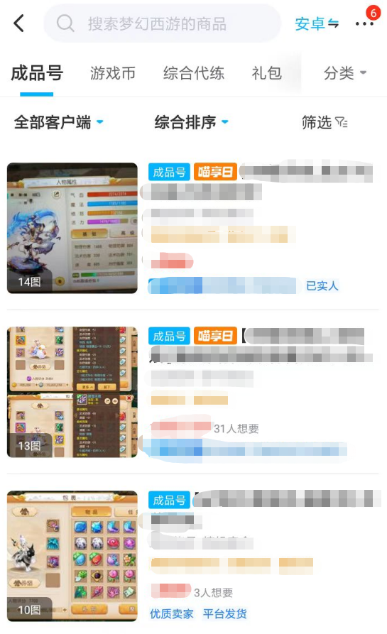 2、各位可以利用搜索功能快速獲取到夢幻西游的交易大區(qū),這里各種精品游戲號將得到展現(xiàn),可以從價格和賣家的信用度來進(jìn)行參考,每一個商品也將帶來相關(guān)截圖,這些信息都將幫助更快速的進(jìn)行了解,從而找到自己喜歡的游戲號并下單。