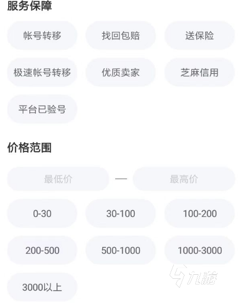 1、剛進(jìn)入平臺當(dāng)中瀏覽商品,部分玩家肯定就會瀏覽到大量不太感興趣的內(nèi)容,這個(gè)時(shí)候各位可以在篩選功能當(dāng)中,選擇好自己覺得合適的賬號價(jià)格區(qū)間,同時(shí)勾選多種服務(wù)保障功能,這樣大家就可以只瀏覽到自己比較滿意的商品信息。
