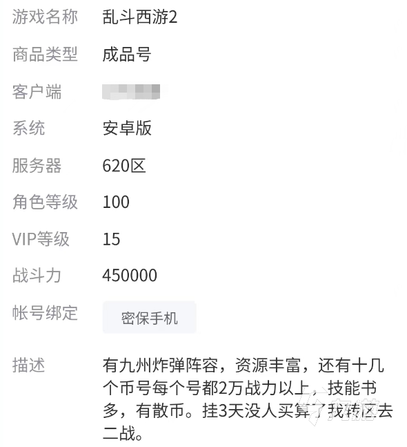 3、買號時要是想對商品有一個全面了解的話,就到商品詳情頁中進行查詢即可,在這個頁面中商品就會多唯獨的展現(xiàn)出來,首先是最基礎(chǔ)的服務(wù)器和客戶端介紹,服務(wù)器會詳細到區(qū)號展示,隨后在下面的“描述”當(dāng)中賣家會對賬號進行補充介紹,此時大家再搭配上賬號的圖片進行分析和選擇即可,這樣一來整個賬號的信息就清晰明了多了。