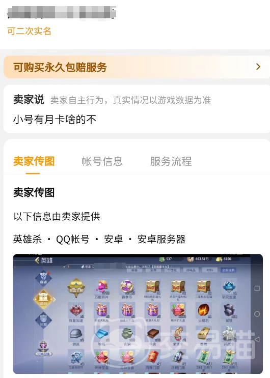 交易貓里任意一個賬號商品只要是排名相對靠前,你就不難發(fā)現(xiàn)它們的信息介紹都特別的齊全,往往都是文字版本的介紹再加上相應(yīng)的配圖,配圖里面會詳細(xì)地展示道具數(shù)量、元寶以及武將角色,有些元寶號為了更加快速得到元寶還會開周卡或月卡,在詳情主頁內(nèi)你就能很詳細(xì)地去了解到賬號中的所有內(nèi)容包括當(dāng)前售賣的一個價格。