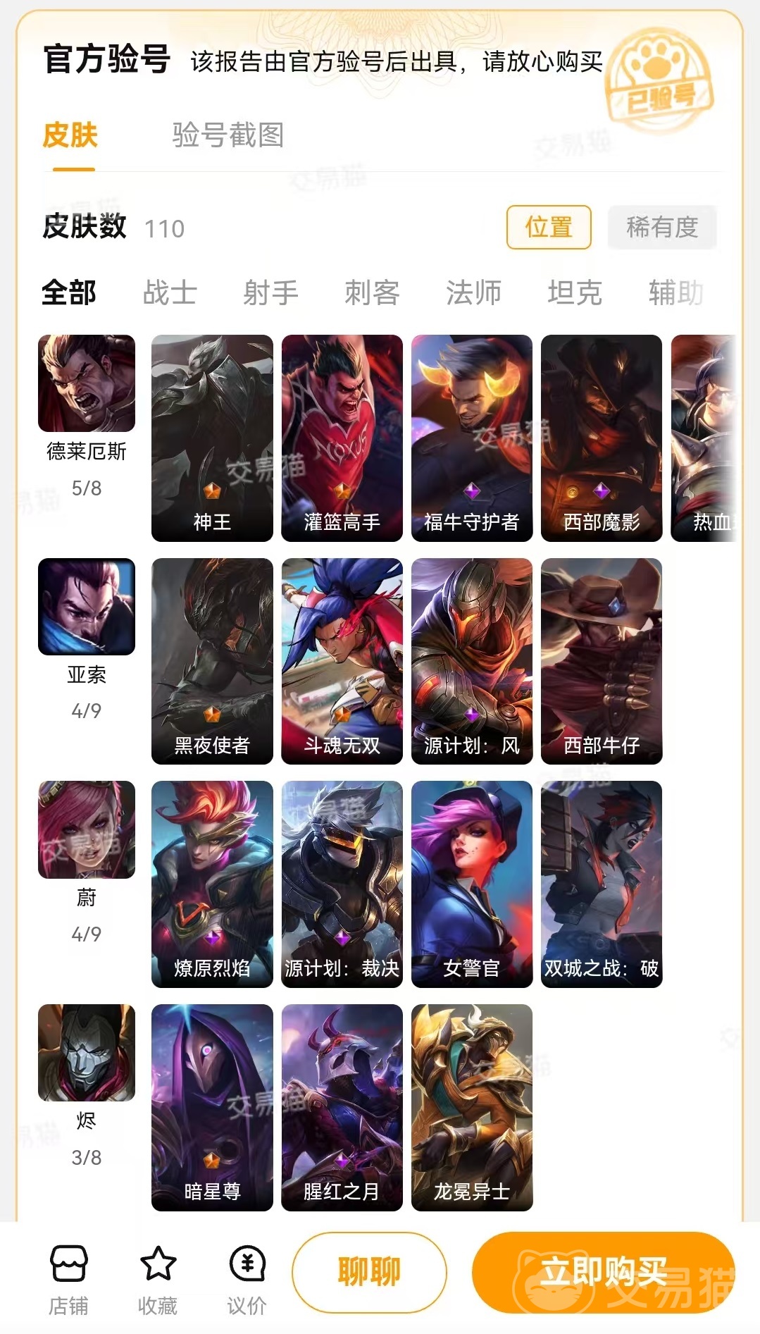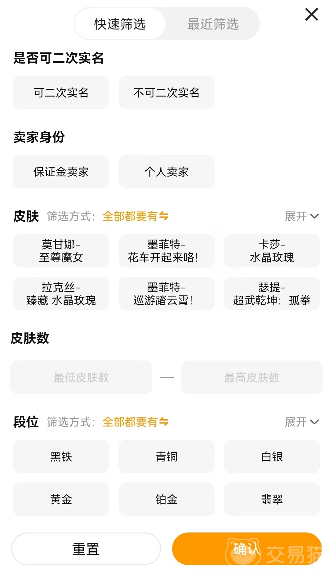 大家找到之后選擇成品號(hào),然后看到有篩選選項(xiàng),這里面就有著很細(xì)致的可選項(xiàng)。例如擁有哪些皮膚,哪些真彩皮膚,終極數(shù)量,神話數(shù)量,皮膚數(shù)量,當(dāng)前段位以及是否具有連體游戲等。只要是自己想要的都,可以選擇或者是輸入進(jìn)去,這樣找到的就是最符合要求的賬號(hào),接下來只需要挨個(gè)點(diǎn)擊查看就可以了。為了能夠保證展現(xiàn)出來的內(nèi)容,確實(shí)是自己需要的,交易貓?zhí)峁┝斯俜津?yàn)號(hào)功能。很多賬號(hào)都帶有官方驗(yàn)號(hào)標(biāo)簽,這表示已經(jīng)經(jīng)過了檢驗(yàn),所推出的報(bào)告,都是官方驗(yàn)號(hào)后出具,在這里直接查看就可以了,非常值得信賴。