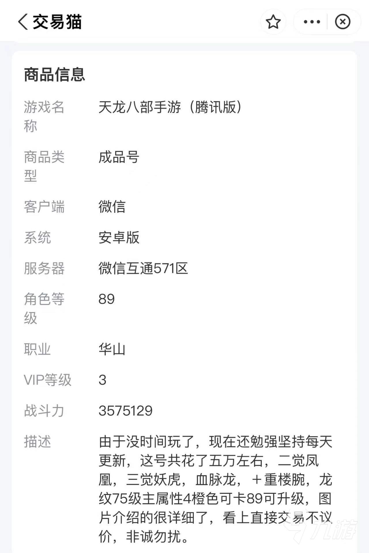由于天龍八部游戲的玩法復(fù)雜,所以一句話(huà)是概括不了里面的資產(chǎn)等信息的。在交易貓里商家們則可根據(jù)自己的需求去描述游戲賬號(hào)里的內(nèi)容,例如角色等級(jí)、會(huì)員等級(jí),還有具體的戰(zhàn)斗能力數(shù)值等等。買(mǎi)家們?cè)谫I(mǎi)之前也可以詳細(xì)地閱覽一下詳情內(nèi)容,比如你的職業(yè)以及門(mén)派是什么,還有哪些神獸、裝備。大大節(jié)省買(mǎi)賣(mài)家彼此的時(shí)間,無(wú)需費(fèi)力地詢(xún)問(wèn)。