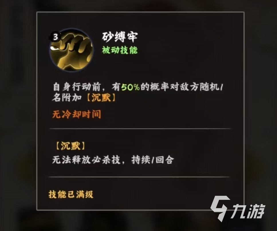 第2個(gè)是被動(dòng)技能砂縛牢,在自身行動(dòng)之前,有50%的幾率對(duì)敵方隨機(jī)一個(gè)忍者附加沉默,對(duì)方被沉默之后無(wú)法釋放必殺技,但是可以進(jìn)行攻擊。該技能沒(méi)有冷卻時(shí)間,此技能觸發(fā)概率比較高,只要臉不是很黑,在一場(chǎng)戰(zhàn)斗中可以觸發(fā)多次。如果能夠開(kāi)局就沉默住對(duì)方的核心輸出,對(duì)于越戰(zhàn)力挑戰(zhàn)是很有幫助的。所以很多戰(zhàn)斗可以多嘗試幾次,賭一賭觸發(fā)幾率的目標(biāo)。