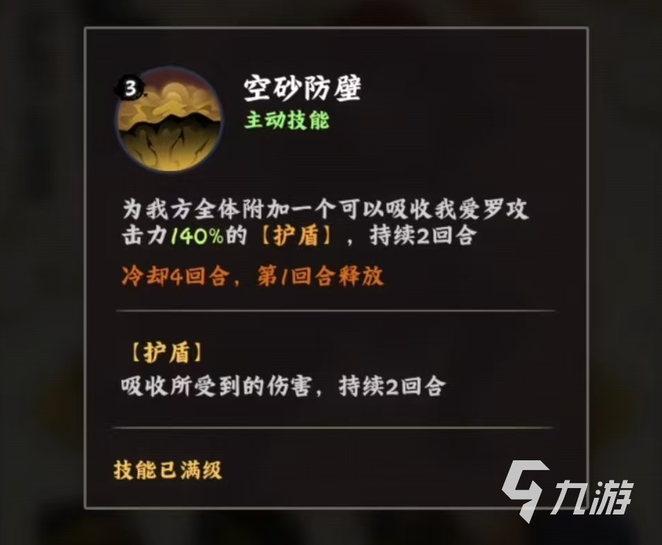 我愛(ài)羅是屬于心類型的忍者,它的品級(jí)為SSS,是游戲中目前最頂級(jí)的忍者之一,大家通過(guò)他的介紹,守護(hù)村子的盾牌,就可以看出他在團(tuán)隊(duì)中的作用。第1個(gè)是主動(dòng)技能空砂防壁,為我方全體忍者添加一個(gè)可以吸收傷害的護(hù)盾,該護(hù)盾是根據(jù)我愛(ài)羅的攻擊力百分比來(lái)進(jìn)行添加,持續(xù)兩個(gè)回合。第1回合就能直接釋放,冷卻四回合。這個(gè)技能直接奠定了我愛(ài)羅這個(gè)忍者在目前陣容搭配中的地位。全體護(hù)盾帶來(lái)的是團(tuán)隊(duì)整體生存能力上升,這要比直接進(jìn)行治療還要有效。