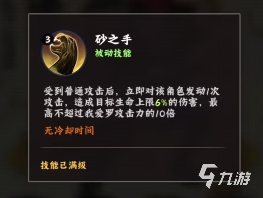 第3個(gè)是被動(dòng)技能砂之手,當(dāng)我愛(ài)羅受到普通攻擊后,可以立即對(duì)傷害來(lái)源發(fā)動(dòng)一次攻擊,按照目標(biāo)當(dāng)前生命上限的6%造成傷害。此技能有傷害上限,最多不超過(guò)我愛(ài)羅攻擊力的10倍。這樣一來(lái),這個(gè)肉盾型的角色依靠反擊,也可以打出比較可觀的傷害,尤其是直接應(yīng)對(duì)敵方的前排肉盾非常有效。最后一個(gè)是被動(dòng)技能堅(jiān)毅不屈,戰(zhàn)斗開(kāi)始時(shí)提升25%的防御,20%的生命值和10%的抗爆,這是作為一名前排肉盾所必備的效果。陣容方面小編有一套推薦給大家,具體選擇是宇智波、大蛇、漩渦鳴人、雷影、我愛(ài)羅和綱手,很值得嘗試。
