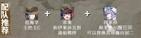 當(dāng)玩家對范海辛的技能足夠了解之后,接下來就需要給他合理的配隊(duì),形成強(qiáng)大的隊(duì)伍,此時可以將范海辛直接跟菲奧和伊萊莎組成強(qiáng)大的陣容,要說這個陣容不僅僅能夠激活暗屬性角色之間的羈絆,而且在技能聯(lián)動方面也能夠直接實(shí)現(xiàn)。其中菲奧能夠?qū)崿F(xiàn)增益,也能夠回復(fù),伊萊莎這個比較擅長一定范圍內(nèi)的控制,這時候三個人就能夠形成一個看上去比較強(qiáng)大的隊(duì)伍。