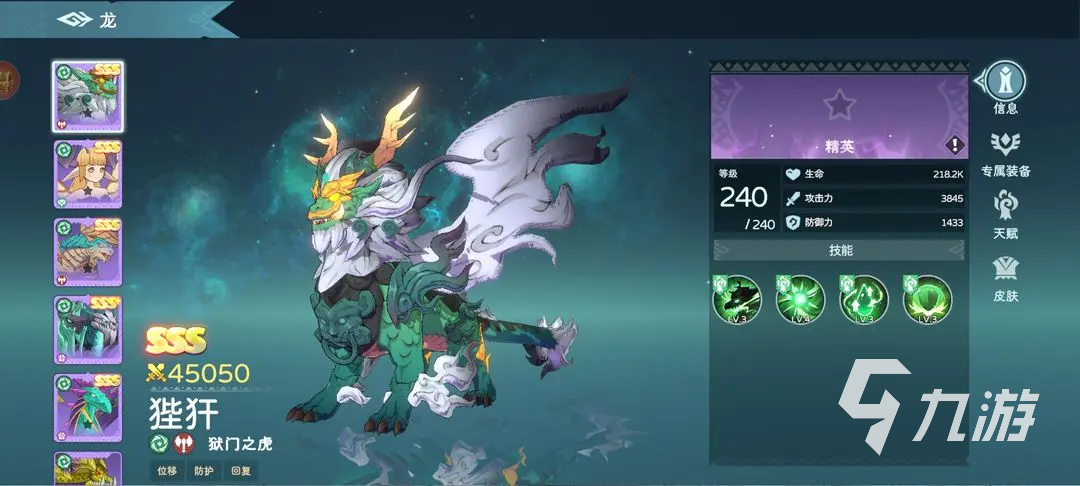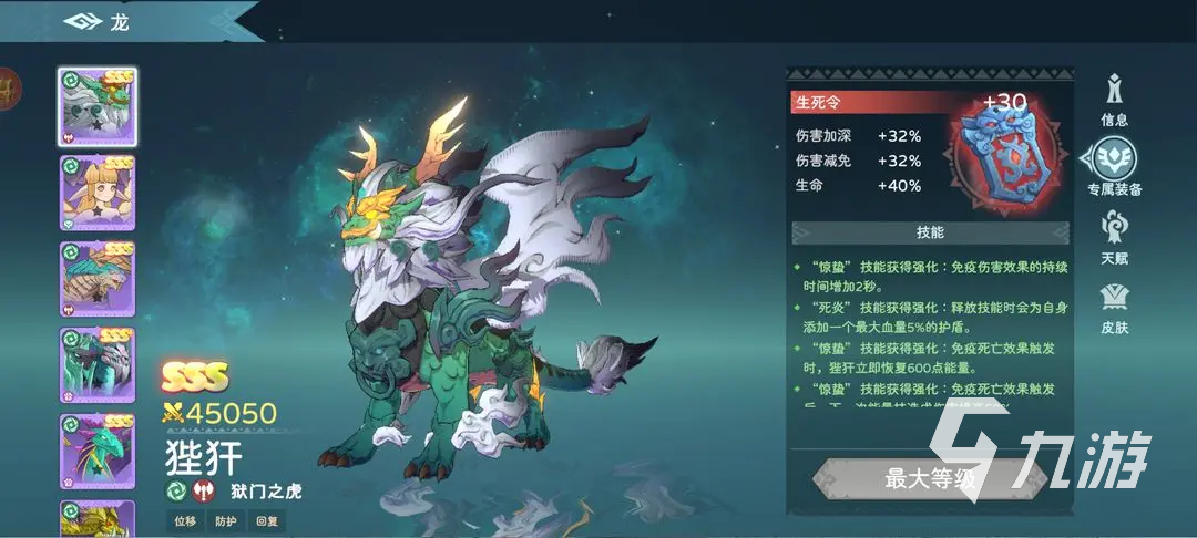 來源: 極光 作者: 油貓餅 2025年07月31日 17:37遇見龍2狴犴怎么樣?狴犴的別名叫做憲章,是中華古代神話里的深受,也是傳說龍的第七個(gè)孩子,看起來十分的具有威力,在游戲里它也是SSS的品質(zhì),定位是一只勇猛龍,坦度和傷害都非常不錯(cuò),可能很多玩家朋友對(duì)該龍的實(shí)力了解不多,接下來就詳細(xì)分析下該角色的技能強(qiáng)度。