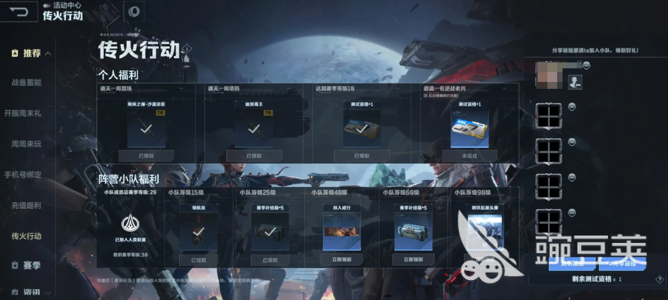 至于傳火,這個(gè)是已有資格的玩家分享的,在活動(dòng)中心里有一個(gè)“傳火活動(dòng)”,分為個(gè)人福利和陣營小隊(duì)福利。個(gè)人福利中有通關(guān)一局獵場、一次塔防、達(dá)到賽季等級(jí)10級(jí)、邀請(qǐng)一名逆戰(zhàn)老兵這四個(gè)指標(biāo)。