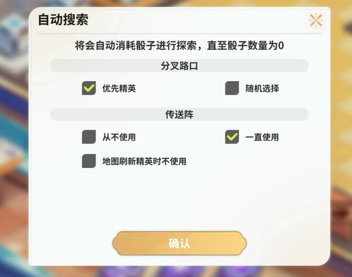 同時在玩法過程中玩家也能開啟自動玩法,只要對玩法進行設(shè)置即可,設(shè)置的是投擲骰子的消耗。在咖啡廳的大富翁玩法中玩家能夠投擲骰子的數(shù)量和玩家們在科技大樓的養(yǎng)成有關(guān),骰子投擲次數(shù)會有限制,因此在游戲中設(shè)定自動消耗骰子數(shù)量直到為0,可以在分岔路徑進行【優(yōu)先精英】和【隨機選擇】的選擇,在傳送陣上也有進行選擇。建議選擇【精英游戲】和【一直使用】傳送陣。